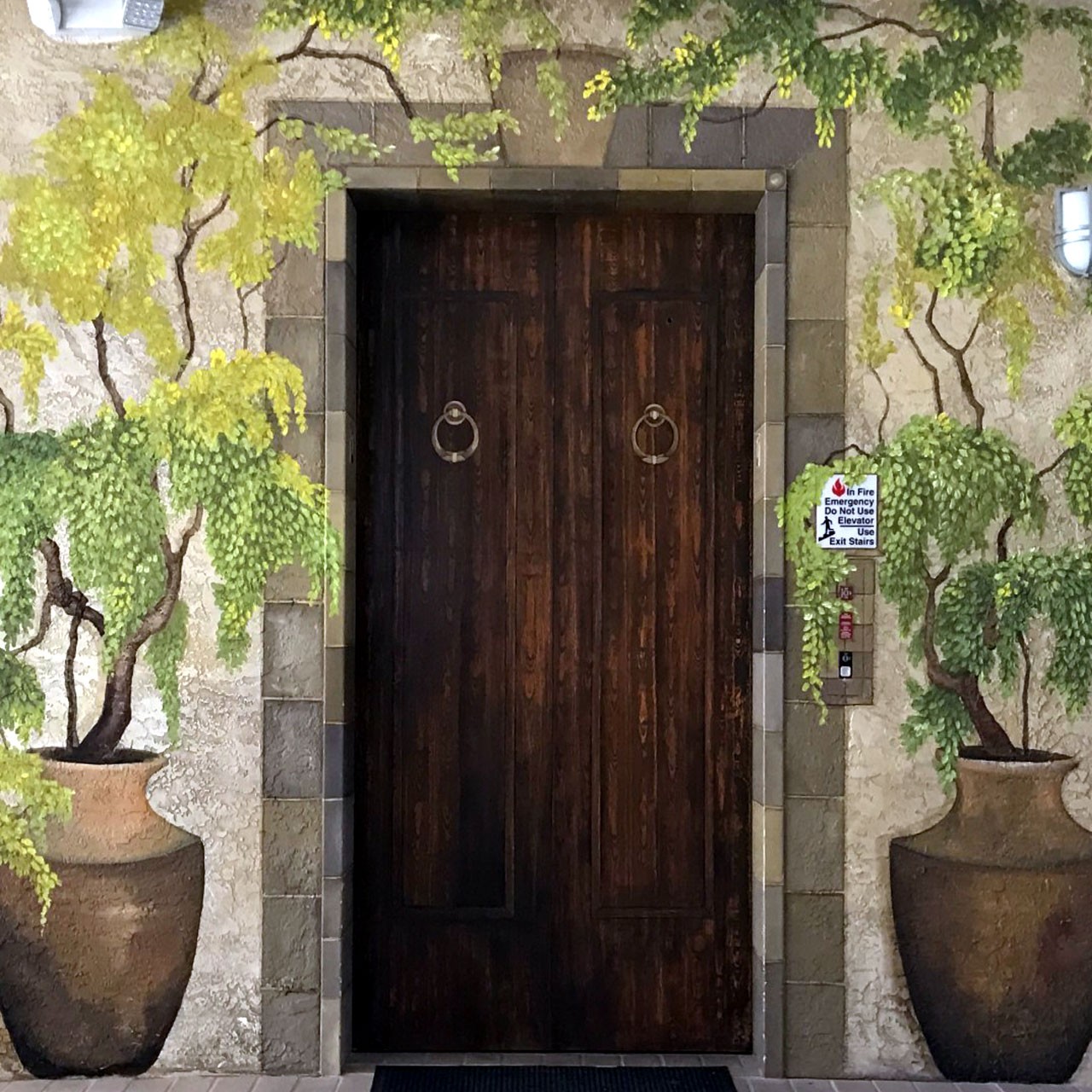 Trompe l’oeil wood and stone technique on elevator door . Textured wall and painted pots with vine